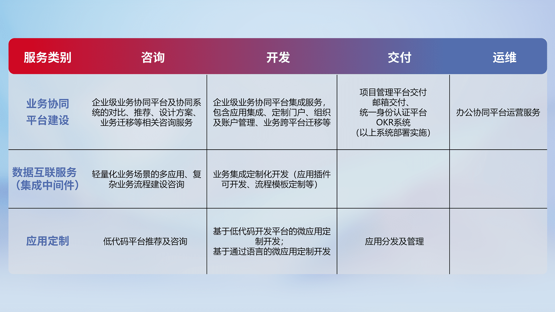 针对钉钉、、、企微、、IDaas等平台级产品提供产品的规划、、、方案、、交付、、、定制化开发等服务,,,,实现如统一协同办公、、、、智能客户服务、、、、混合会议管理、、、智能数据查询、、等业务场景,,,,实现数字化转型。。。